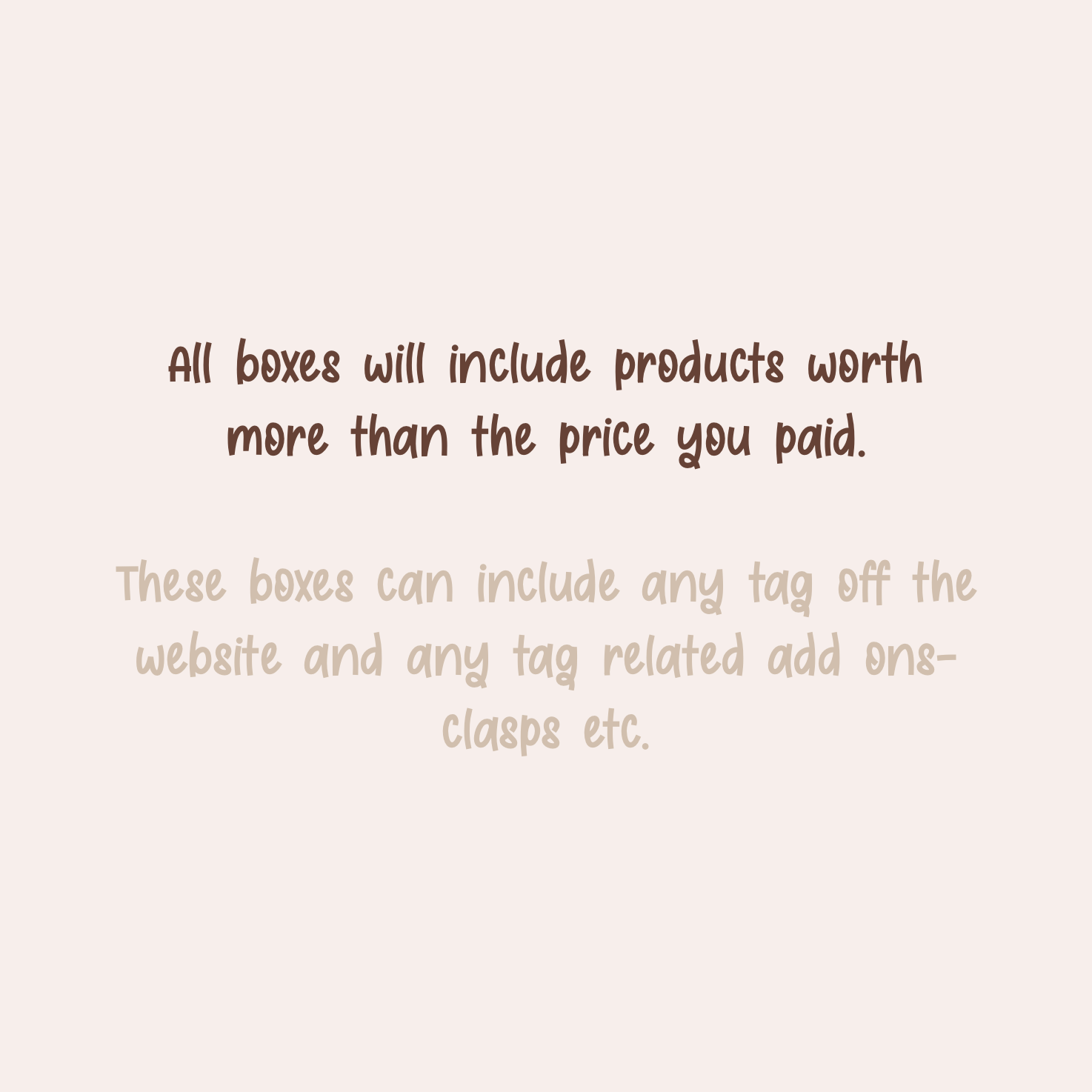 all boxes will include products worth more than the price you paid, tag only boxes can contain any tags off the website including clasps.